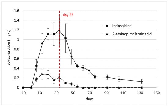 The concentration of indospicine [13], as well as that of 2-aminopimelamic acid, was observed to rapidly increase in plasma of camels 1–6 in the first 13–20 days after commencement of the feeding trial (Figure 3). The indospicine concentration reached a plateau phase before it decreased slowly after ceasing the Indigofera uptake. The concentration of the 2-aminopimelamic acid similarly rose in the first 13 days, plateauing for about two weeks, before it slightly decreased and rose to a second maximum at 32 days, the point at which the Indigofera intake was stopped. In the depletion phase, when the remaining camels (camels 4–6) were fed an Indigofera-free diet, the 2-aminopimelamic acid concentration followed the indospicine concentration in a slow decrease until no 2-aminopimelamic acid was detectable at 62 days (30 days after cessation of Indigofera consumption).