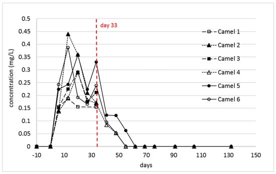 Individual 2-aminopimelamic acid concentrations of plasma during the first 32 days (n = 6) of the treatment and after cessation of Indigofera spicata feeding (n = 3). Camels 1–3 were autopsied at day 33.