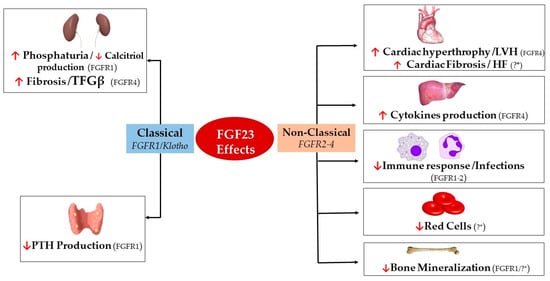 Final classical and non-classical clinical effects of FGF23 on different organs. TFGβ, transforming growth factor βeta; PTH, parathyroid hormone; LVF, left ventricle hypertrophy; HF, heart failure. ↓ Decrease; ↑ Increase; ?* Presumably Klotho-independent.