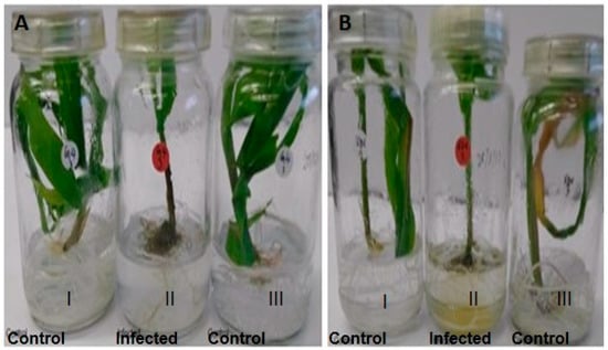 The respective GAF4 (A) and KDV1 (B) maize lines with and without Aspergillus flavus KSM014 infection. The uninfected maize control plants (I & III) and the infected plants (II) are shown 14 days after germination.