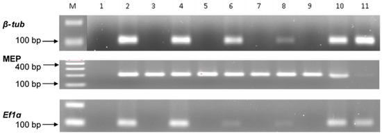 For assessing the integrity and quality of the isolated DNA, samples from control and infected tissues of the plant, and saprophytic fungi were subjected to PCR analysis with the reference genes under the following amplification conditions: 95 °C for 10 min; 35 cycles of 95 °C for 3 s, 64 °C for 20 s, 72 °C for 1 s for MEP and at Ta 62 °C for both β-tub and Ef1α.