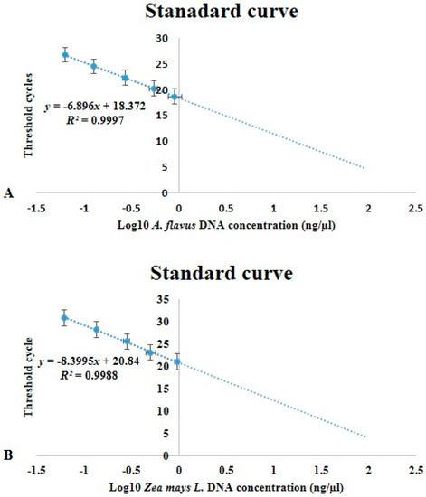 A ten-fold serial dilution of pooled 10 ng genomic DNA extracts from control plants and A. flavus were used to generate standard curves. For each dilution, the threshold cycle (Ct) values were plotted against the logarithm of the starting quantity of the template. Efficiencies of amplification were generated from the slopes of the standard curves slopes [53,54]. Linear regression curves were drawn, and the qPCR efficiency calculated as: