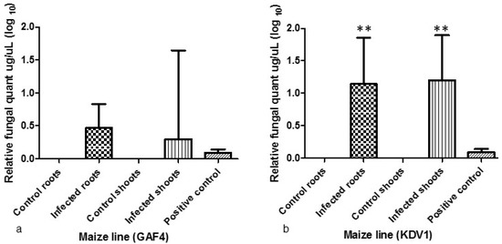 The qPCR assay was performed 14 days post infection for both shoot and root tissue. No significant difference was seen in fungal biomass between the control and infected plant tissues for the GAF4 maize line (Figure 4a). In contrast, significant differences (p < 0.05) in fungal biomass for the KDV1 maize line was observed upon infection for both the root and shoot tissue (Figure 4b). The amount of fungal DNA was lower in the infected tissue of GAF4 maize line when compared to the KDV1 line.
