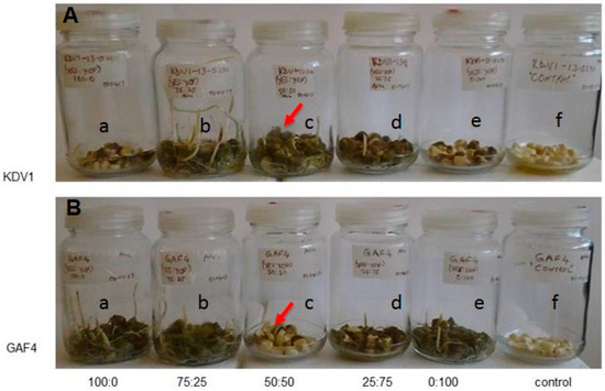 The co-infected maize lines KDV1 and GAF4 had different rates of fungal colonisation following co-inoculation with A. flavus KSM012 and KSM014 (Figure 5). The maize kernels of the resistant (GAF4) and sensitive (KDV1) lines were co-infected with atoxigenic, and aflatoxigenic strains at different ratios (0:100; 25:75; 50:50; 75:25; 100:0), respectively. As expected, control plants inoculated with sterile water had no fungal growth, which indicated that there was no contamination by fungal spores during the experimental procedure (Figure 5f, controls). The KDV1 maize kernels had higher levels of colonisation by A. flavus compared to GAF4 maize kernels at a co-infection ratio of 50:50 (Figure 5c).