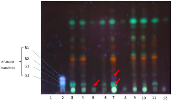 Thin Layer Chromatography (TLC) was carried out on a TLC silica gel 60 plate 20 × 20 cm (Merck, KGaA, Darmstadt, Germany). Acetonitrile/methanol/formic acid (9:1:0.2 v/v) was used as the mobile phase. Ten microliters of the aflatoxin standard mix containing 5.86 µg/mL of AFB1 and AFG1, and 1.70 µg/mL of AFB2 and AFG2 and 20 µL of test samples were spotted on TLC plates and run for 70–90 min in a TLC tank at RT. The plates were left to air dry in the fume hood at RT for approximately 30 min. Dried plates were either observed under UV light (wavelength 254 and 366 nm), or sprayed with p-anisaldehyde solution, vanillin solution or exposed to an iodine vapour. The intensity of the sample spots against the standard aflatoxins were compared and aflatoxins concentrations calculated based on the equation: