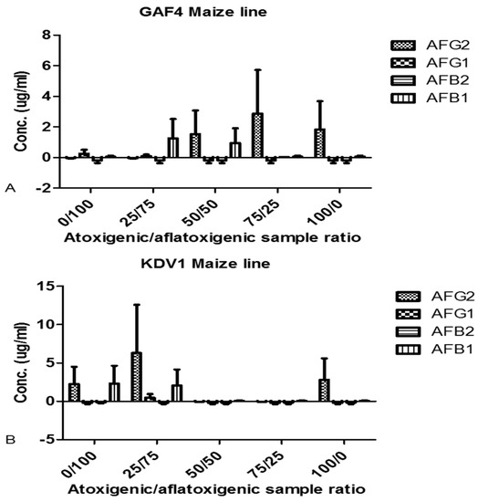 Biocontrol of aflatoxins by atoxigenic isolates is a cost-effective method for managing aflatoxins and could provide a long-term solution to aflatoxin contamination in developing countries, including sub-Sahara Africa [20]. The implementation of biocontrol strategies showed a reduction in aflatoxin contamination of peanuts and cereals by approximately 74.3% to 99.9% when coated with atoxigenic A. flavus strains [19,20]. These observations were similar to our results where aflatoxins were not detected or reduced [33,44]. Our results suggest that maize lines that have adequate resistance to A. flavus together with the appropriate biocontrol strategy may limit the possibility of aflatoxicoses outbreaks.