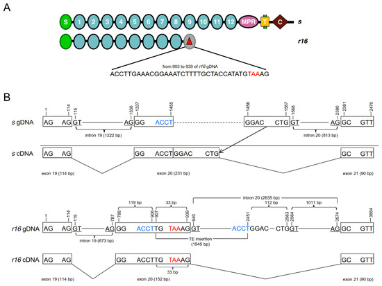 Figure 1. PgCad1 r16 mutation. (A) r16 and s allele protein alignment showing amino-terminal membrane signal sequence (S), cadherin repeats (1–12), membrane proximal region (MPR), transmembrane region (T), and cytoplasmic domain (C). The red triangle indicates the truncation of the protein predicted from r16 because of the premature stop codon (red letters TAA). (B) r16 and s allele gDNA/cDNA alignment. The red letters TAA indicate the premature stop codon and the blue letters ACCT indicate the target site duplications (TSDs). Underlined letters GT/AG indicate a splicing site.