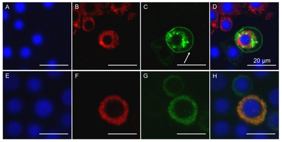 Figure 2. Cellular localization of PgCad1 proteins within Hi5 cells. Hi5 cells transfected with pIE2-sPgCad1-GFP (AD) and pIE2-r16PgCad1-GFP (EH). Nuclei stained with Hoechst 3342 are shown in blue, dsRED-labeled endoplasmic reticulum is shown in red, and GFP-labeled PgCad1 fusion proteins are shown in green. Superimposed images from (AC) are shown in (D) and from (EG) in (H). The arrow in (C) indicates the cell membrane. Bar = 20 μm.