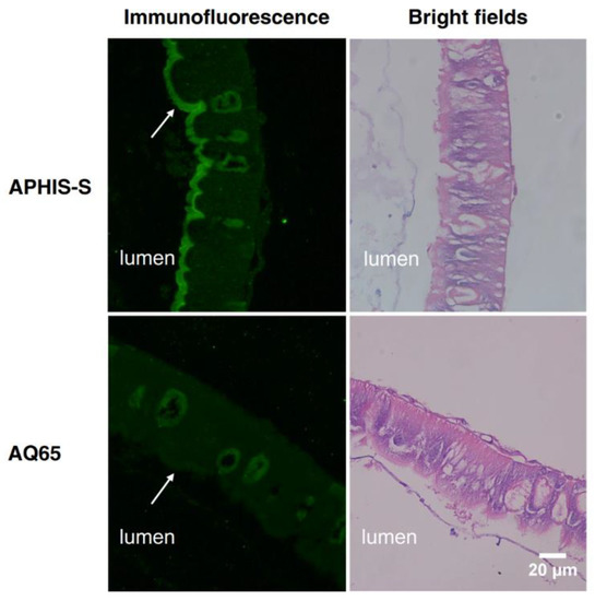 Figure 4. Localization of the cadherin protein in midgut tissue sections of the fourth instar APHIS-S and AQ65 larvae. The cadherin protein was revealed by immunofluorescence using rabbit anti-PgCad1 antibody (see Methods Section for details). Arrows point to the brush border microvilli membrane. Bar, 20 µm.