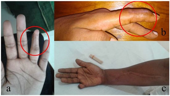Various long-term local effects of the bites by Merrem’s hump-nosed pit viper (Hypnale hypnale) in Sri Lanka: (a) a contracture deformity involving the distal interphalangeal joint of the ring finger in left hand (red circle); (b) a contracture deformity involving the distal interphalangeal joint of the index finger in left hand (red circle); and (c) amputation of the right little finger due to local necrosis with the fasciotomy due to compartment syndrome of the right forearm. (All photographs are published with permission of the patients).