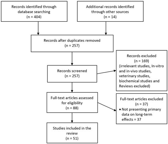 We carried out a search in MEDLINE from 1946 and EMBASE from 1947 to 14 October 2018 and included clinical studies in English on snakebite that describe long-term or chronic effects. We used the search terms “snake envenoming”, “snake envenomation”, “snake bite”, and “ophitoxaemia” in combination with the terms “chronic”, “long term”, “delayed”, “prolonged”, “disability”, “persistent”, “permanent”, “morbidity”, and “recurrence”. We then searched the reference lists of retrieved articles for additional publications relevant to the topic. This search yielded 404 abstracts. After removing duplicates and non-clinical studies, we identified a total of 88 abstracts for further study and the full articles of these were reviewed. From these, we excluded 37 studies that were not presenting primary data and the remaining 51 studies were included in this study (Figure 2). For this review, we classified conditions that last or appear more than six weeks following envenoming as long term or delayed effects of envenoming. We identified different themes/effects of long-term consequences of the snake envenoming based on the content of the included articles.