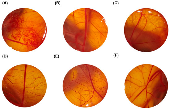 The results showed that, in the positive control, initial injuries were observed in the first 30 s, as hemorrhage and rosette-like coagulation, which further increased within 5 min (Figure 2). The average cumulative score of the positive control of 0.1 M NaOH was 21.11 ± 0.32 (Figure 2A and Table 1). In the negative control, no modifications were observed after 5 min, and the OII was ≤0.9 ± 0.0 (Figure 2B and Table 1). LyeTxI-b formulation, at the four tested concentrations, showed no signs of vascular response (Figure 2C–F), and the average cumulative scores were ≤0.9 ± 0.0, which categorized this formulation as non-irritant when applied on CAM surface (Table 1).