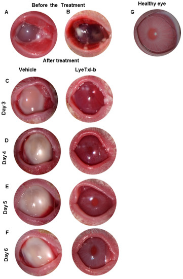 Photomicrographs of the ocular disease in rabbits at post infection (PI) with S. aureus. (A) Eye control: infected with S. aureus before receiving the vehicle. (B) Eye infected with S. aureus before receiving the LyeTxI-b eye drop. (C) Vehicle: three days PI with S. aureus treatment with vehicle; and LyeTxI-b: three days PI with S. aureus treatment with LyeTxI-b. (D) Vehicle: four days PI with S. aureus treatment with vehicle; and LyeTxI-b: four days PI with S. aureus treatment with LyeTxI-b. (E) Vehicle: five days PI with S. aureus treatment with vehicle; and LyeTxI-b: five days PI with S. aureus treatment with LyeTxI-b. (F) Vehicle: six days PI with S. aureus treatment with vehicle; and LyeTxI-b: six days PI with S. aureus treatment with LyeTxI-b. (G) Healthy eye.
