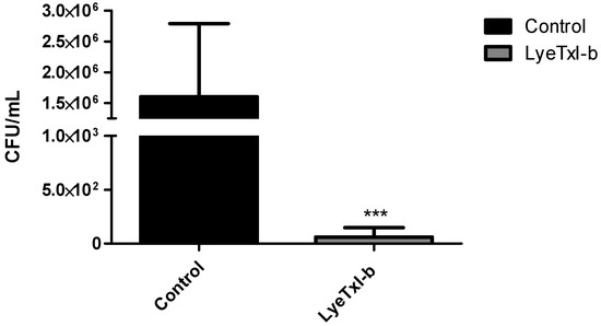Quantification of viable S. aureus in infected rabbit eyes. CFU per infected rabbits eye (Control and LyeTxI-b (28.9 µmol/L), n = 6/group) after topical inoculation of S. aureus (1 × 108 CFU). Data are expressed as the mean ± SD. Asterisk indicates Control vs. LyeTxI-b treatment unpaired t-Student test, *** p < 0.001.