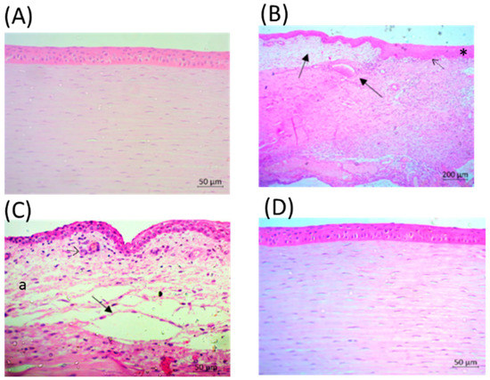 Histopathologic analysis of the infected eyes demonstrated congestion of the vascularized tissue of the anterior chamber (Figure 6B,C) and severe edema (Figure 6C). In addition, there was an increase in the corneal epithelium, stroma infiltrate with polymorphonuclear cells, erythrocyte diapedesis, serous exudate accumulation between the collagenous fibers, and destruction of the Bowman’s membrane (Figure 6B,C) on PI Day 6.