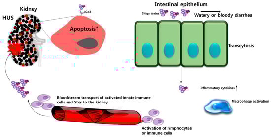 During the prodromal diarrheal phase of disease, Stxs may induce expression of a broad array of pro-inflammatory molecules by intestinal epithelial cells, as well as endothelial cells and macrophages present in the lamina propria. Among these mediators, some (TNFα and IL-1β) may exacerbate vascular damage through sensitization of endothelial cells in the gut and other organs by up-regulating the expression of the toxin receptor Gb3 [130,131,132,133]. However, human intestinal microvascular endothelial cells have been reported to constitutively express high levels of Gb3 [134] suggesting that cytokine-mediated sensitization may be less critical for vascular damage in the gut.