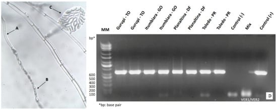 Morphological structures of Fusarium verticillioides, being, (A) conidiophore; (B) microconidia in a long chain; (C) microconidia in false heads; (D) molecular weight of samples of fungal isolates obtained from maize, cultivated in different locations: Gurupi, Tocantins (TO); Itumbiara, Goiás (GO); Planaltina, Federal District, (DF) and Toledo, Paraná, (PR). Negative control (Control −): sound corn leaf; Mix: relative control, no DNA addition; Positive control (Control +): isolated from F. verticillioides.