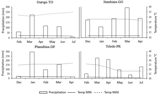 Climatic variables represented by the maximum and minimum temperatures (°C) and precipitation (mm) verified in Gurupi, Tocantins (TO); Itumbiara, Goiás (GO); Planaltina, Federal District (DF); and Toledo, Paraná (PR) during the conduction of the maize experiment.