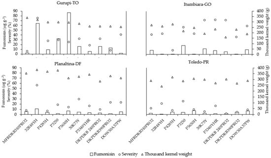 The hybrid P3630H showed low to intermediate severity, at 3.78 (25.56% of the ear area exhibited visible symptoms of fungal infection). It had a thousand kernel weight of 295.22 g and the highest FB1 content found in Gurupi, TO, with a content of 86.7 μg g−1. There was a positive correlation between the high concentrations of fumonisin in this hybrid and high temperatures (Table S2). The low severity of the disease and the production of high fumonisin levels have also been verified by Saunders et al. [], who noted that there is generally no difference in the visual appearance of maize with low or high concentrations of fumonisins in relation to severity levels. On the other hand, we can compare it to another hybrid such as 32R48YH, in which high severity of disease in the ears correlated with high levels of the mycotoxin (a correlation of 0.73). The P3630H hybrid demonstrated that, in addition to severity level, other variables may be related to the production of mycotoxins, including genetics.