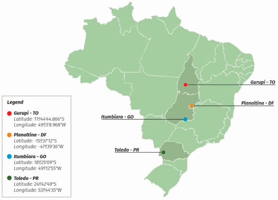 These experiments were conducted during the 2015–2016 harvest in experimental maize farms located in distinct areas of Brazil, including the municipalities of Gurupi, Tocantins state (TO); Toledo, Paraná state (PR); Planaltina, Distrito Federal (DF); and Itumbiara, Goiás state (GO), as shown in Figure 4.