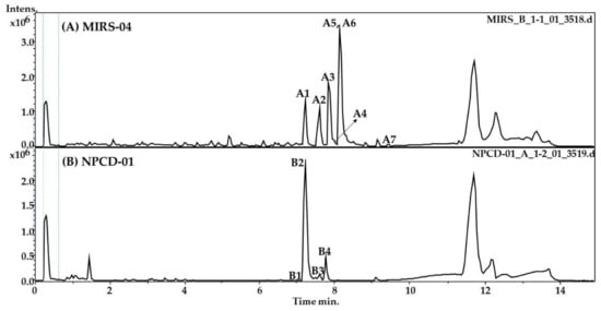 Representative base peak chromatograms detected in positive mode electrospray ionization (ESI), acquired in a LC-HR-QTOF-MS (60-2000 m/z). Microcystis panniformis (MIRS-04): (A1) micropeptin K139, (A2) micropeptin 959, (A3) microcystin-LR, (A4) microcystin HiLR, (A5) micropeptin 973, (A6) micropeptin and (A7) microcistin-LY.and Microcystis aeruginisa (NPCD-01): (B1) microginin FR1, (B2) microginin FR2/FR4, and (B3) microginin SD-755 and (B4) unknown.