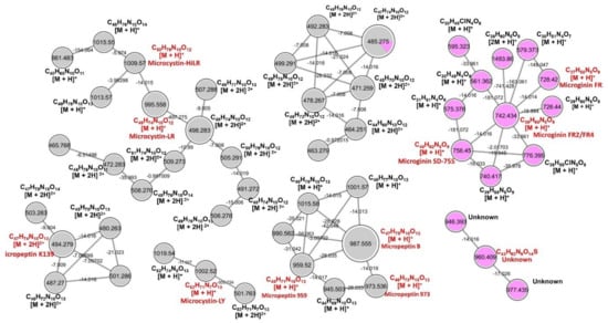 Cyanopeptides were identified according to their deconvoluted mass spectra, m/z, molecular formula, exact mass, MS2 spectra and also using the GNPS database. Cytoscape was applied for analyzing molecules clustering with a similar fragmentation profile. Cytoscape software integrated main molecules (Table 1) with other peaks and spectra present in the samples, creating groups of compounds with similar characteristics and fragmentation profiles (Figure 2).