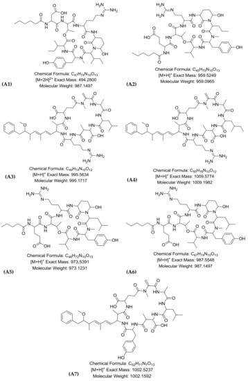 Cyclic peptide structures produced by M. panniformis strain MIRS-04: (A1) micropeptin K139, (A2) micropeptin 959, (A3) microcystin-LR, (A4) microcystin HiLR, (A5) micropeptin 973, (A6) micropeptin B and (A7) microcistin-LY.
