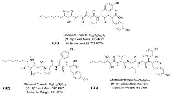 Microginins produced by M. aeruginosa strain NPCD-01: (B1) microginin FR1, (B2) microginin FR2/FR4 and (B3) microginin SD-755.