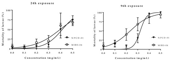 Mortality of Astyanax altiparanae larvae (%) vs. concentration (mg/mL) of extracts of strain MIRS-04 and NPCD-01. Data are expressed as dose-response curves as ± SD of five replicates of the assays (MIRS-04 and NPCD-01) and the LC50 values are represented for exposure times of 24 and 96 h. (Statistically significant values are at the p < 0.05 level).