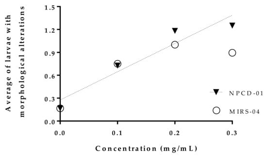 From the total of observed larvae, >50% presented oedema in the digestive system (ODS) at an exposure concentration of 0.3 mg/mL of the strains MIRS-04 and NPCD-01 p < 0.05 (Table 3). The larvae exposed at the concentration of 0.3 mg/mL of MIRS-04 and NPCD-01 presented up to three different types of morphological alterations in the larvae (Figure 6). The results of the morphological alterations also showed that the number of abnormalities in the larvae increased with the concentration of the extracts, p < 0.05 (Figure 6 and Figure 7).