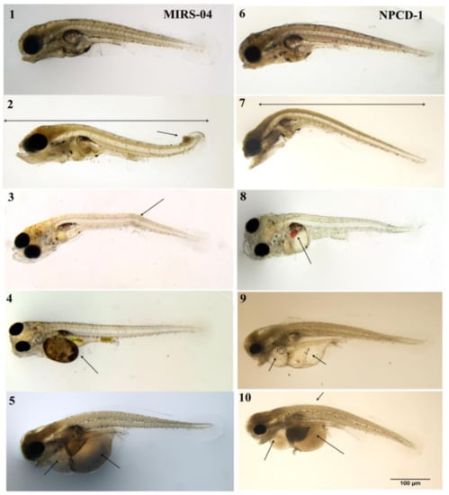Morphological changes in Astyanax altiparanae larvae caused by exposure to extracts of the MIRS-04 and NPCD-01 strains at concentrations of 0.1, 0.2 and 0.3 mg/mL (dried weight). MIRS-04: 1—normal larvae (control), 2—alteration in the tail, column and body length, 3—spinal curvature, 4—digestive system oedema, and 5—oedema in the pericardium and digestive system oedema. NPCD-01: 6—normal (control) larvae, 7—curvature of the spine (cervical lordosis), 8—oedema with haemorrhage, 9—oedema in the pericardium and digestive system oedema, 10—oedema in the pericardium, digestive system oedema and curvature in the cervical spine.