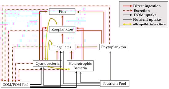 Competition, predation, and allelopathic interactions between cyanobacteria and mixotrophic flagellates are an underrepresented trophic link that may be important in structuring the microbial food web (see Figure 1). Metabolic coupling between cyanobacteria and mixotrophic flagellates may depend on their position on the nutritional gradient. Laboratory work in this and other studies support the theory that the presence of mixotrophic protists can have an impact on cyanobacteria, including reductions in population growth rate and production of cyanotoxins. Whereas mixotrophs on the heterotrophic extreme of the nutritional gradient seem to gain growth benefits from cyanobacterivory, population growth of Cryptomonas, a primary phototroph, was largely unaffected by the presence of toxic and non-toxic strains of Microcystis. Instead, Cryptomonas may use organic carbon supplied from cyanobacterial filtrate to maintain, but not enhance, its growth. The microbial loop has revealed that bacteria are a critical link between dissolved organic matter and higher trophic levels through ingestion by heterotrophic and mixotrophic flagellates. Cyanobacterivorous protists may also mediate nutrient remineralization though detoxification of secondary metabolites and provide a subsidy to the classic food web.
