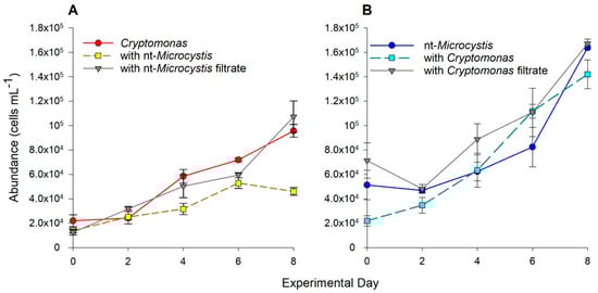 Changes in cell abundance of (A) Cryptomonas and (B) non-toxicMicrocystis (nt-Microcystis) over the experimental period (eight days) when grown alone in monoculture, co-culture, or with reciprocal filtrate. Error bars represent standard error of the mean from three replicate samples.