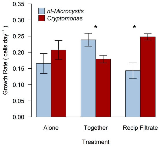 Population growth rate (cells day−1) of Cryptomonas over the eight-day period was 0.20 day−1, 0.18 day−1, and 0.25 day−1 when grown alone, in co-culture with nt-Microcystis, and with reciprocal filtrate, respectively (Figure 3). Growth rate in co-culture or with filtrate from nt-Microcystis was not different from when Crytomonas was grown alone (ptogether, alone = 0.53, pfilt, alone = 0.29). However, population growth rate of the mixotroph was significantly higher when cultured with filtrate from nt-Microcystis than in direct, co-culture with the cyanobacteria (ptogether, filt = 0.05). Population growth rate (cells day−1) of nt-Microcystis grown alone, in co-culture with Cryptomonas, and in the presence of reciprocal filtrate was 0.18 day−1, 0.25 day−1, and 0.19 day−1, respectively (Figure 3). nt-Microcystis exhibited the highest population growth rate in the physical presence of Cryptomonas (ptogether, alone = 0.04, pfilt, together = 0.09, pfilt, alone = 0.86). The population growth rates of nt-Microcystis and Cryptomonas were not significantly different from one another when either were grown in monoculture (p = 0.28). However, nt-Microcystis exhibited a significantly higher population growth rate than Cryptomonas in the co-culture treatment (p = 0.02).
