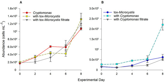 Changes in cell abundance of (A) Cryptomonas and (B) toxic-Microcystis (tox-Microcystis) over the experimental period (8 days) when grown alone in monoculture, co-culture, or with reciprocal filtrate. Error bars represent standard error of the mean between three replicate samples. Note the change in scale between panels.