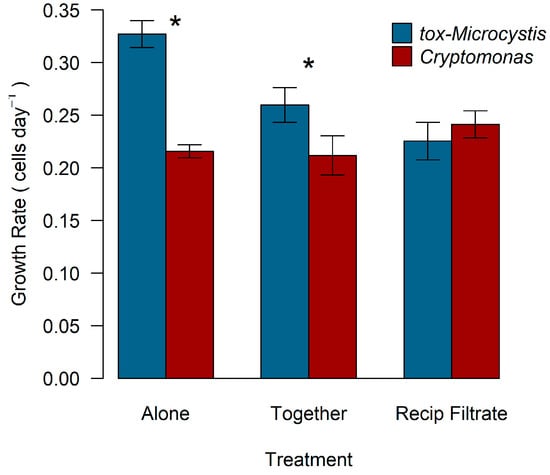 Population growth rate (cells day−1) of tox-Microcystis and Cryptomonas when grown alone in monoculture, incubated in co-culture, and with reciprocal filtrate. Growth rate determined by slope of the linear regression of ln-transformed cell abundance values plotted over time (days). Asterisks indicate statistically significant differences between species within the same treatment (p < 0.05). Errors bars represent standard error of the mean from three replicate samples.