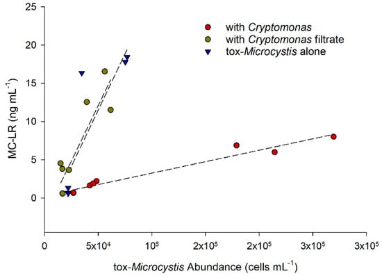Relationship between total microcystin-LR (MC-LR, L=leucine, R=arginine, located at positions 2 and 4, respectively, on cyclic molecule) concentration and cell abundance of tox-Microcystis during incubation with Cryptomonas, filtrate from the mixotroph, or alone in monoculture. Data includes three replicate values from each day of experimentation.