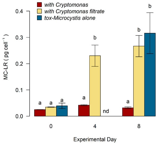Intracellular concentration of microcystin-LR (MC-LR) in tox-Microcystis after incubation with Cryptomonas, filtrate from the mixotroph, or alone in monoculture. Letters above bars indicate results of non-parametric ANOVA (Kruskal–Wallis) performed on MC-LR cell−1 within each treatment day. Note that MC-LR was not measured in tox-Microcystis monoculture on day 4 (nd = no data).