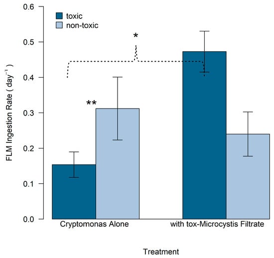 Ingestion rate (cells day−1) of toxic and non-toxic fluorescently labeled Microcystis (as measured by disappearance) in treatments with either Cryptomonas alone or cultured with filtrate from tox-Microcystis. Error bars represent standard error of the mean from three replicate samples. Asterisks indicate statistically significant differences (p < 0.05): * Between ingestion rate of toxic FLM when Cryptomonas was grown alone or with addition of tox-Microcystis filtrate; ** Between ingestion rate of toxic and non-toxic FLM when Cryptomonas was grown alone.
