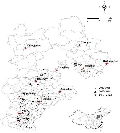 Map of Hebei province indicating the sampling sites during the periods 2005–2006 and 2013–2016.