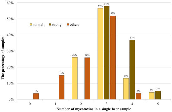 Grain and, thus, their products might be contaminated with various species of molds. Furthermore, each species can produce several mycotoxins, therefore, it is important to evaluate their co-occurrence. The association of mycotoxins might enhance the adverse health effects when compared to individual compounds [35]. More than 93% of the samples contained at least two mycotoxins, i.e., OTA and DON; and at least three compounds were present in 74% of the analyzed beers. The highest number of mycotoxins detected in one sample was 5 (3% of the samples). The distribution of mycotoxins in particular beer samples has revealed that the highest percentage, up to 60% of the samples of each group, contained 3 mycotoxins (Figure 2).