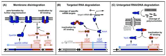 - Adler, E.; Barák, I.; Stragier, P. Bacillus subtilis locus encoding a killer protein and its antidote. J. Bacteriol. 2001, 183, 3574–3581. [Google Scholar] [CrossRef]