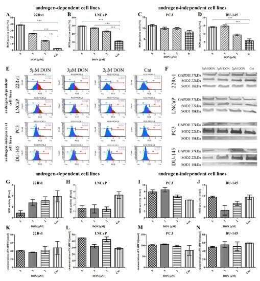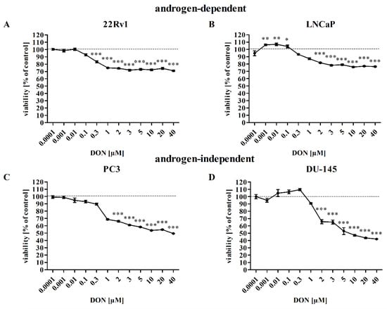 Therefore, the aim of the present study is to determine whether DON might induce oxidative stress and apoptosis in prostate cancer cells in non-chronic conditions (24 h exposure), mimicking acute exposure to DON (>1 µM). The androgen ratio and androgen receptor (AR) expression in PCa patients plays a crucial role, both in the process of carcinogenesis and in the progression of the tumor [23]. As DON is reported to modulate the process of steroidogenesis in animals through the modulation of testosterone [24], various androgen-dependent (LNCaP) and androgen-independent (DU-145, PC3) in vitro prostate cancer models were used to evaluate the DON-induced oxidative stress in PCa, as well as castration-resistant (22Rv1) models.