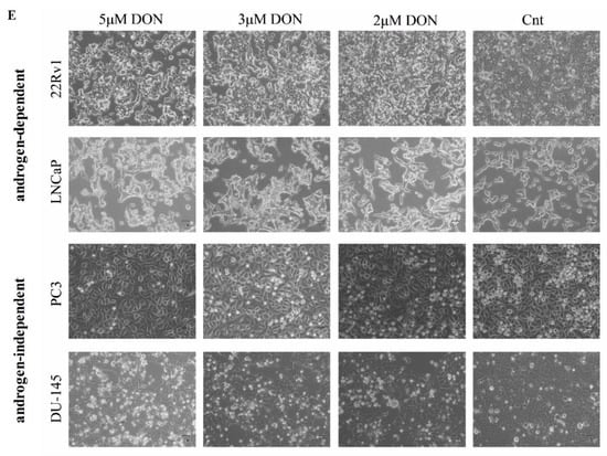 DON decreases the viability of prostate cancer cells. The results were obtained by MTT assay and expressed as a percentage of control cells for 22Rv1 (A), LNCaP (B), PC3 (C), and DU-145 (D) cells. Changes in cell morphology after 24 h of DON treatment (E). p < 0.05 was considered statistically significant, *** p < 0.001 as compared to the control. DON—deoxynivalenol, Cnt—control.