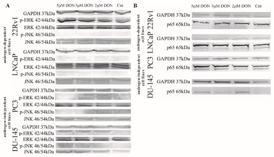 The MAPK signal transduction pathway is highly conserved and plays a critical role in cell growth, differentiation, apoptosis, proliferation, and the response to environmental stress [43]. The results of this study showed that DON activates the MAPK signaling pathway, the phospho-ERK and the phospho-JNK in a concentration-dependent manner. DON is reported to modulate MAPKs in human immune cells [44] and in porcine epithelial cells [45,46]. It was previously observed that DON modulates the MAPK signaling pathway, and this effect is associated with the induction of apoptosis in piglet hippocampal nerve cells [47]. It is also possible that the observed effect of DON in PCa cells is associated with the MAPK signaling pathway.