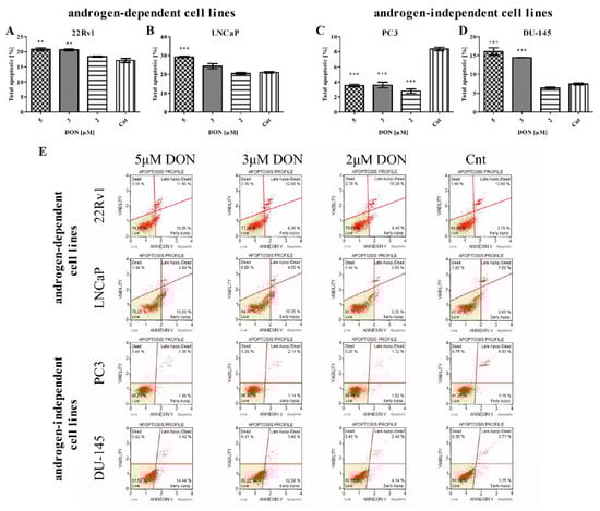 DON induces apoptosis in prostate cancer cells. The changes in the number of apoptotic (early and late apoptotic) in 22Rv1 (A), LNCaP (B), PC3 (C), and DU-145 (D) cells after DON treatment were measured and expressed as the percentage of gated cells; non-treated cells were used as controls; the values are expressed as the mean ± SE; p < 0.05 was considered statistically significant, *** p < 0.001, ** p < 0.001, * p < 0.05 as compared to the control. The representative results of the Apoptosis Profile after DON treatment (E). DON—deoxynivalenol, Cnt—control.