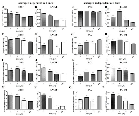 DON modulates the expression of p53, p-p63, cleaved Casp3, and PARP in 22Rv1 (A,E,I,M), LNCaP (B,F,J,N), PC3 (C,G,K,O), and DU-145 (D,H,L,P) cells. The results of ELISA are presented as absorbance values. p < 0.05 was considered statistically significant, *** p < 0.001 ** p < 0.01, as compared to the control cells. DON—deoxynivalenol, Cnt—control.