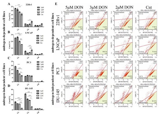 The influence of DON on the mitochondrial potential of 22Rv1 (A), LNCaP (B), PC3 (C), and DU-145 (D) cells. The changes in the number of live cells with depolarized mitochondria (LL), dead cells with depolarized mitochondria (UL) and dead cells with mitochondria that had not been depolarized (UR) after DON treatment were estimated by the Muse™ MitoPotential Assay; non-treated cells were used as a control; the values are expressed as the mean ± SE; p < 0.05 was considered statistically significant, *** p < 0.001, * p < 0.05 as compared to the control. A representative histogram of the cell health profile after DON treatment (E). DON—deoxynivalenol, Cnt—control.
