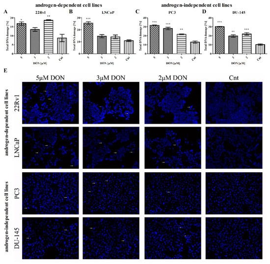 The influence of DON on DNA damage. The changes in the percentage of cells with damaged DNA after DON treatment in 22Rv1 (A), LNCaP (B), PC3 (C), and DU-145 (D) were expressed as the percentage of gated cells; non-treated cells were used as a control; the values are expressed as the mean ± SE; p < 0.05 was considered statistically significant, *** p < 0.001, ** p < 0.001, * p < 0.05 as compared to the control. DAPI stained nuclei (E) after DON treatment, and non-proper nuclei morphology was marked with white arrows; non-treated cells were used as the control. DON—deoxynivalenol, Cnt—control.