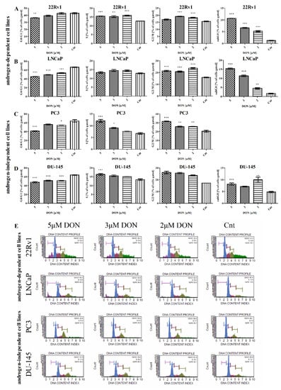 The treatment with DON caused an increase in the percentage of cells in the S phase of the cell cycle for all tested lines. The statistically significant increase in the percentage of 22Rv1 cells in the S cell cycle phase was observed for all tested doses (** p < 0.01, *** p < 0.001) of DON. The increase in the S cell cycle phase was also observed in PC3 and DU-145 cells, although it was statistically significant only for the 5 µM DON dose (*** p < 0.001) in both lines and for the 3 µM DON dose (* p < 0.05) for the PC3 cells.